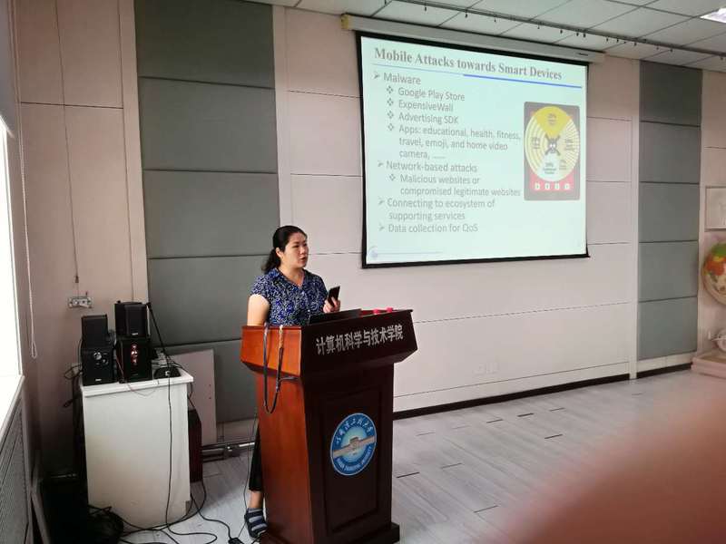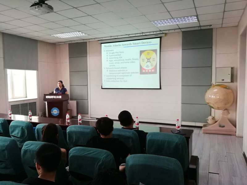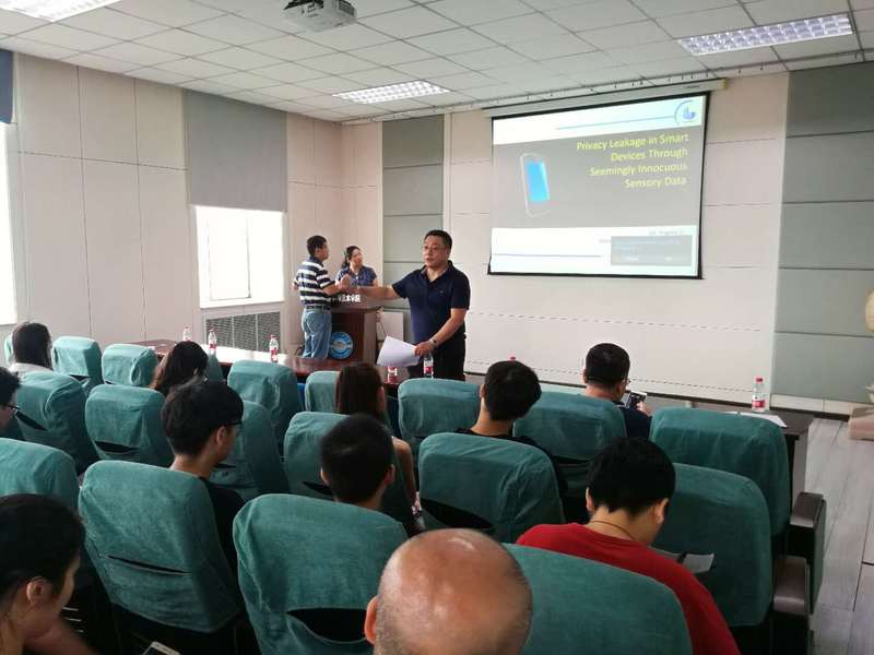 首先,科研副院长韩启龙教授向与会人员介绍李教授简历,针对学院与佐治亚州立大学在学生培养、科学研究等方面开展的合作进行了回顾和展望,并就交流内容向与会人员进行了提醒,要求双方交流要紧密围绕学术、科研开展。李教授结合其实验室目前的研究内容展开讲解,从数据隐私保护的重要性、研究背景、研究方案等方面详细的说明了当前移动设备安全保护方面的漏洞和急需解决的问题。报告环节之后,李教授同与会人员开展互动交流,与会教师同学踊跃提问,李教授均一一耐心回答,本次学术报告使欧冠师生及时了解到国际最新研究动态,对开展科研工作起到积极的促进作用。