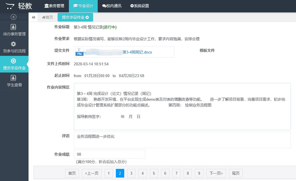 2、要求学生每两周在毕业设计指导系统——轻教系统按要求提交情况记录,如不按时间提交,第一次提醒,第二次警告,第三次计入毕业设计最终成绩;