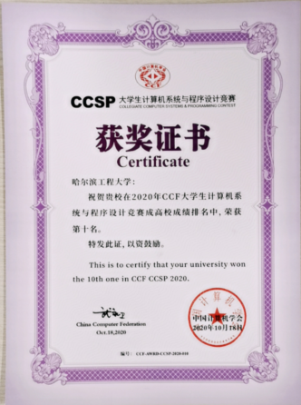 2020 CCF大学生计算机系统与程序设计竞赛(CCSP)于10月17日在全国的64所CSP认证点高校举办,来自全国67所高校的1016名选手参赛。我校成绩全国排名第十,在工信部七所学校中排名第一。其中张凌源同学获得个人东北区第一,全国第十四的好成绩。