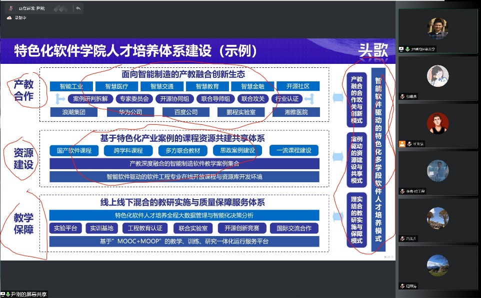 会上冯光升副院长介绍了目前特软学院建设推进的进展情况。学院老师针对欧冠目前采用的一些教学实验平台以及目前课程建设进展进行简单介绍。尹刚主任针对高校特色化课程与专业建设教学体系创新与应用展开讲解,重点讲解课程建设、专业建设、产教融合的问题关键,介绍了头歌在线课程建设与特色专业创新环境,针对特软学院人才培养体系建设进行深入剖析,针对目前学院所采用教学实验平台遇到的一些问题,演示头歌教学实验平台以提供解决方案。