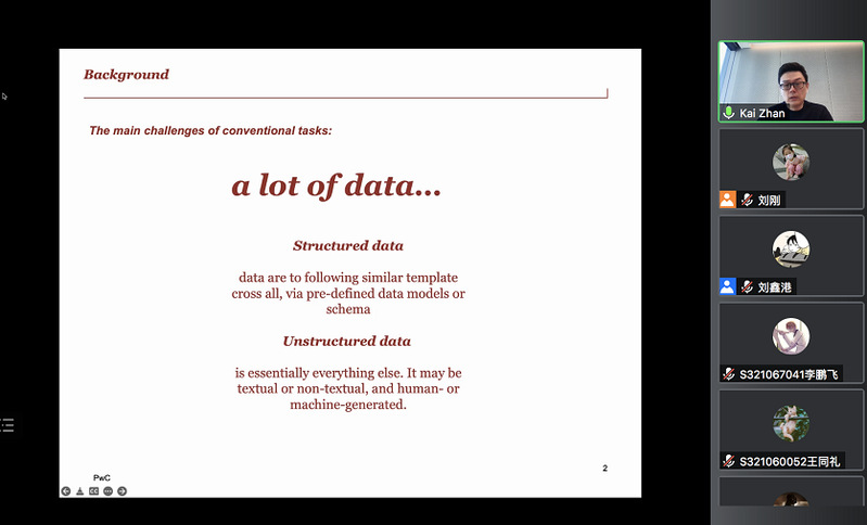 2022年6月14日,欧冠官方网站举行2022年第三期(总第七期)智汇论坛。本次活动邀请普华永道澳大利亚首席数据科学家和高级经理Kai Zhan,以“机器学习在咨询审计领域的应用”为题作专题讲座。