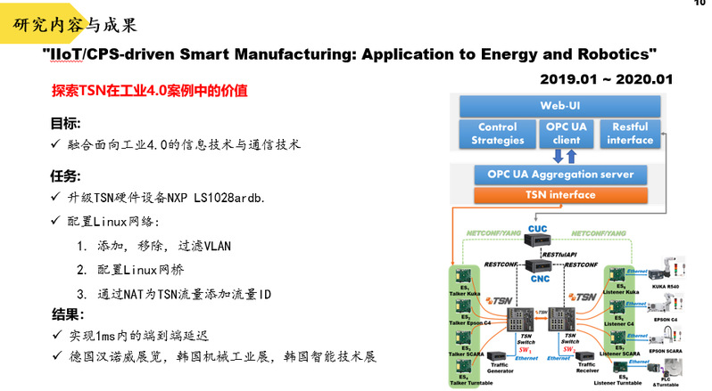 江俊慧老师主要研究方向为工业物联网、智能制造、时间敏感网与边缘计算。本次报告主要介绍了时间敏感网TSN相关背景知识,TSN的产业图谱,以及TSN在工业场景中的两类应用,包括TSN与OPC UA技术的结合和TSN在工业4.0典型案例中的表现,同时,介绍了TSN流量调度算法。
