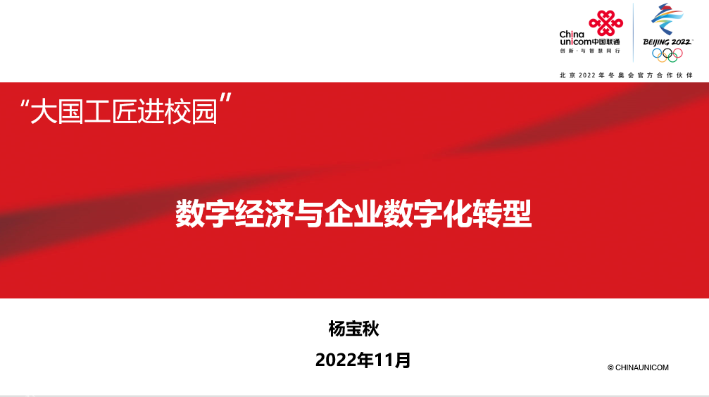 杨宝秋总监报告题目为“数字经济与企业数字化转型”的报告,本次报告以数字经济知识为切入,以中国联通为样例,多维度地介绍了企业数字化转型的背景、现状以及必要性。以点带面地介绍了十四五规划以及云计算、大数据、AI等前沿科学知识。最后,阐述了在数字化转型中企业对于人才的具体需求。