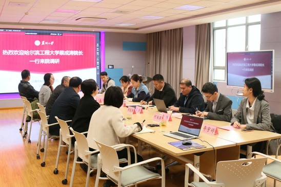 在苏州大学调研中,调研团首先参观了物联网教学实验室、信创实践中心、信创课程教研室、网络教学实验室。苏州大学计算机学院党委书记胡新华对苏州大学基本情况进行了介绍,常务副院长赵雷介绍了苏州大学计算机学院的历史沿革和发展目标、科研和师资队伍建设等,蔡成涛院长对学校和学院情况进行了介绍。双方就工程硕士校企联合培养、人才引进和青年教师考核、科研方向与学科方向谋划、信创课程设置、校企联合实验室运行模式等方面开展交流座谈。胡新华书记希望加强学生互访,面向国家需求,通过项目专题制开展周期性交流。苏州大学计算机学院党委副书记李恩秀、综合办公室主任何书萍、学工办公室主任高珊、科研办公室主任查伟忠参加了此次交流座谈会。