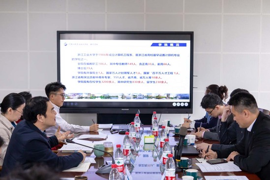 在浙江工业大学调研中,调研团首先参观了浙工大中控信息智慧交通联合创新实验室和智能感知与系统教育部工程研究中心。调研会上,浙江工业大学计算机学院院长梁荣华介绍了学院组织机构设置、师资队伍建设、教学科研成果、学科评估情况、科研方向、教学名师培育计划等,蔡成涛院长对学校和学院情况进行了介绍。双方就新教师考核、专业硕士入企、教师考核机制、一站式学生社区建设、青年教师培育、科研团队激励政策等内容进行了交流。浙江工业大学计算机学院副院长沈国江、党委副书记毛诗焙、网络工程系主任李燕君、计算机科学与技术系主任汤颖、办公室副主任陈婉君、团委书记张苗苗等参加了此次调研会。