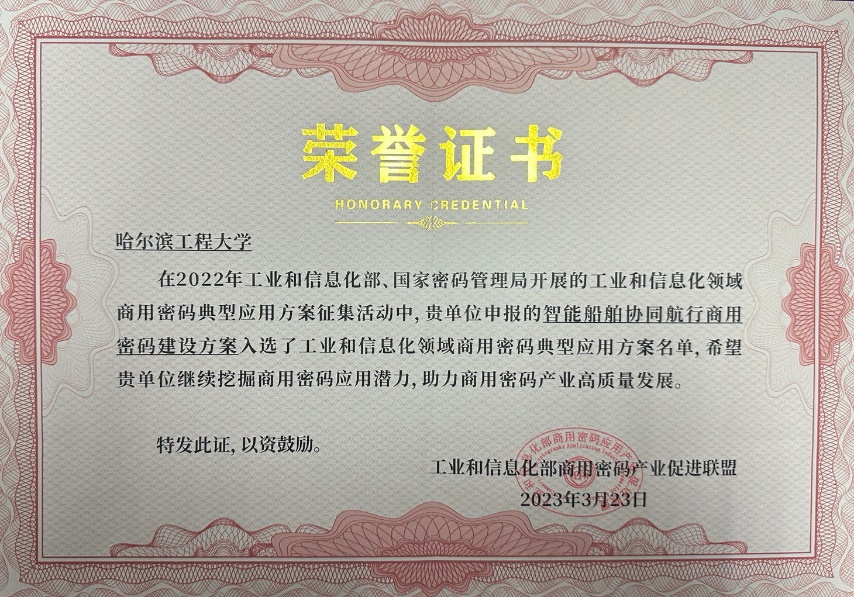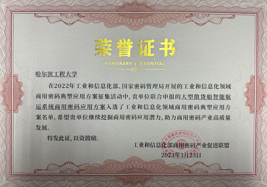 欧冠官方网站牵头申报的“智能船舶协同航行商用密码建设方案”、参与申报的“大型散货船智能航行系统商用密码应用方案”两项方案均入选工业和信息化领域商用密码典型应用方案名单。