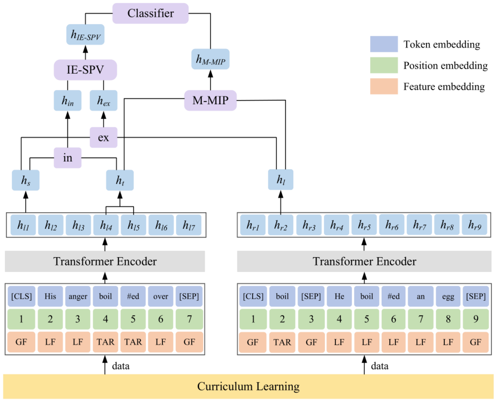 该成果瞄准隐喻检测(Metaphor Detection)这一自然语言处理领域国际前沿学术问题,开展了较为深入的研究。隐喻检测任务主要面临两类挑战:一是如何有效利用上下文、语法和语境等句子信息;二是如何充分利用有限的标注数据。论文提出的MiceCL方法为解决上述问题做出了技术突破。MiceCL通过设计全新的框架,能够有效捕捉目标隐喻词与上下文信息的复杂语义关系。MiceCL还引入了自动计算困难度的课程学习算法,能够先易后难地学习数据中的知识,充分利用有限的标注数据。相比于现有最佳方法,MiceCL的整体性能获得了显著提升,且模型的收敛速度大幅提高。