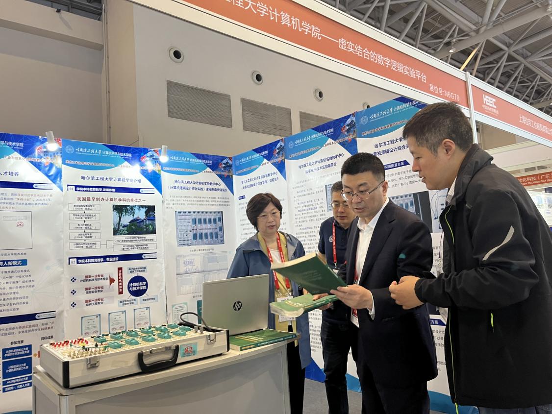 展会首日,黑龙江省高等教育学会会长赵国刚、秘书长姜君莅临展位指导并给予好评。校党委常委、副校长赵玉新,校长助理、本科生院常务副院长耿敬,本科生院副院长骆毅,本科生院副院长刘海波等校领导亲临现场指导,并就计算机科学与技术基础学科拔尖创新人才培养和计算机硬件虚拟仿真实验相关建设表示了肯定和期待。