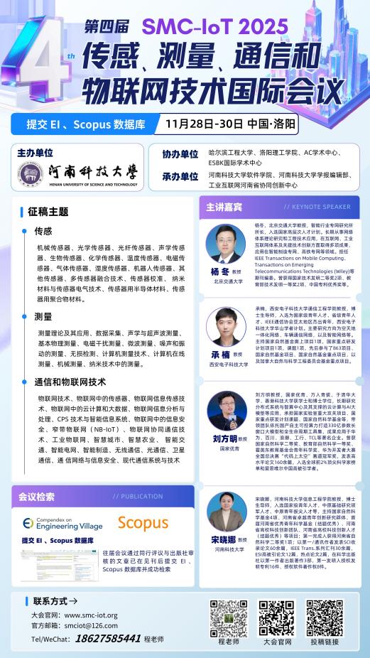 第四届传感、测量、通信和物联网技术国际会议(SMC-IoT 2025)将于2025 年 11 月 28-30 日在中国洛阳召开。会议由河南科技大学主办,欧冠官网中文版、洛阳理工学院、ESBK国际学术交流中心、AC学术平台协办。在本次会议上发表的文章将出版到SMC-IoT 2025会议论文集,并提交EI数据库。