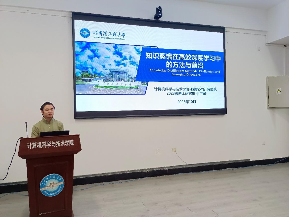 来自欧冠官方网站的数据协同计算团队代表于丰铭,随后带来了其在数据蒸馏理论、方法及系统构建方面的前沿探索,展示了高效数据处理能力在解决大规模复杂问题中的潜力。最后,该学院人工智能与媒体计算团队的朱亚隆,汇报了团队在人工智能前沿算法、媒体内容分析与生成等领域的创新工作,凸显了智能技术在提升系统感知与交互能力方面的广阔应用空间。